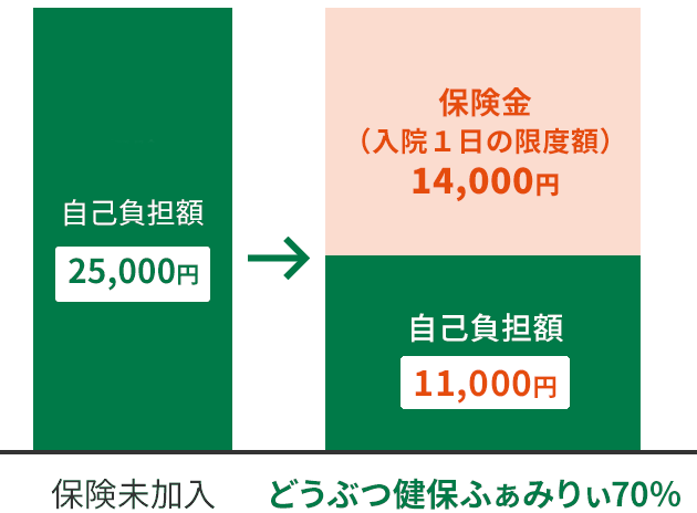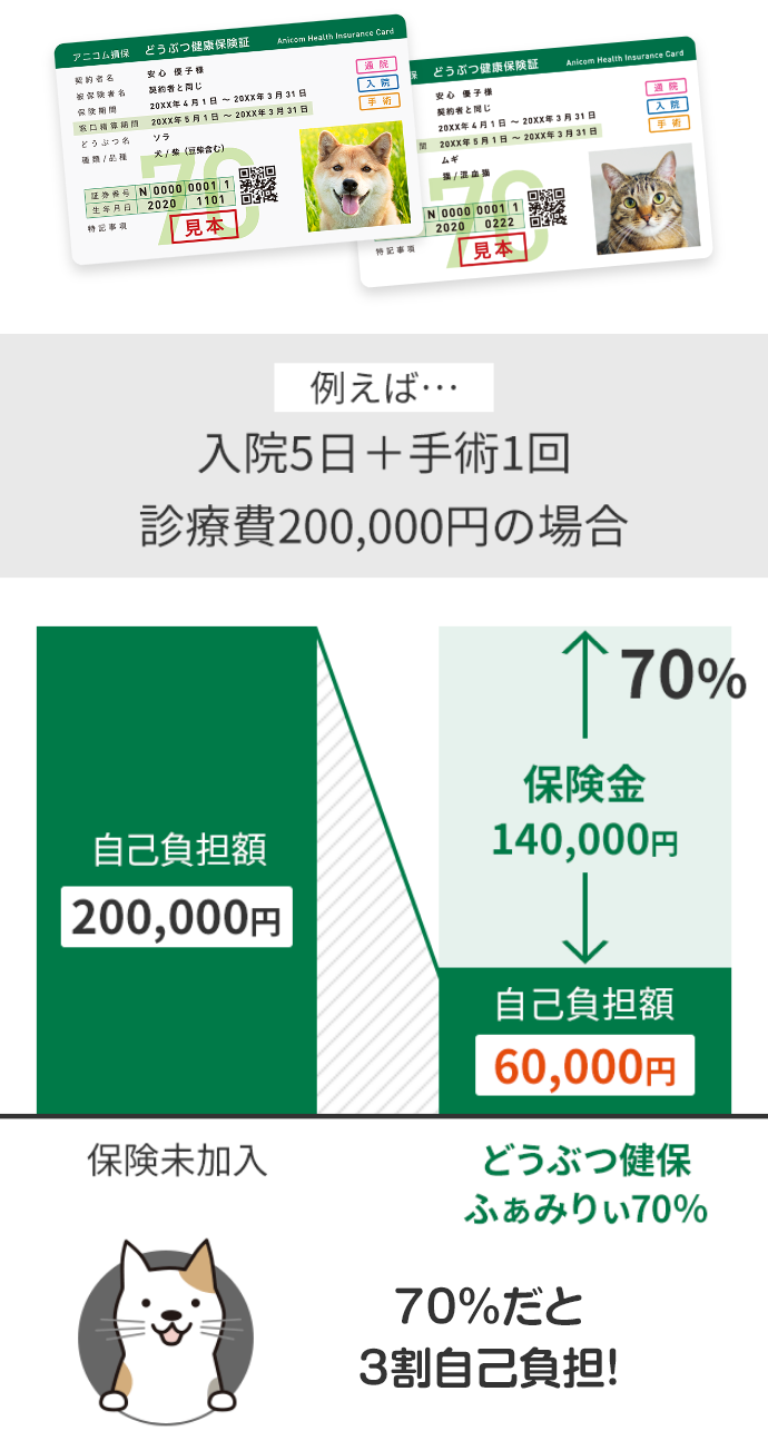 どうぶつのケガ・病気に対して、保険の対象となる診療費の70%または50%を支払限度額の範囲内でお支払いします。