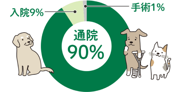実際にアニコム損保への保険金請求における年間の診療をみてみると、「通院・入院・手術」の中で、90%以上を「通院」が占めています。