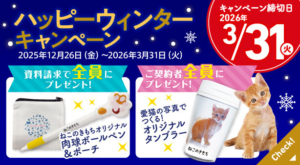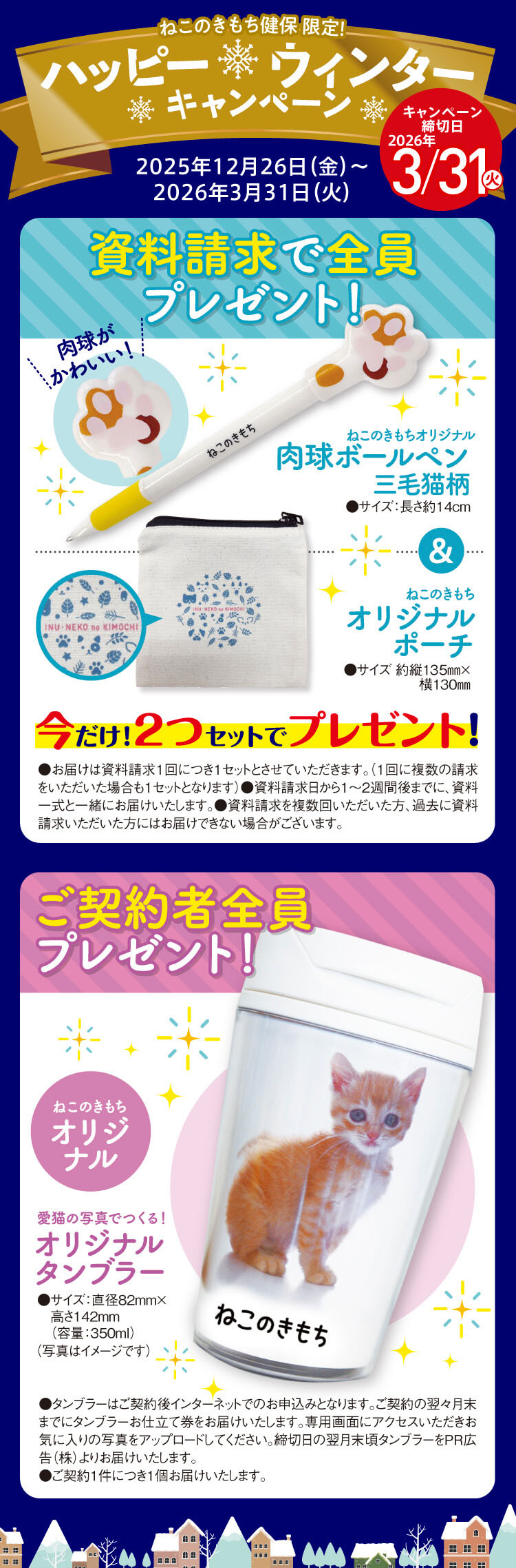 「ねこのきもち健保」限定キャンペーンは、キャンペーン期間中に当ホームページより手続きいただいた方が対象となります。お間違えないようご注意ください。