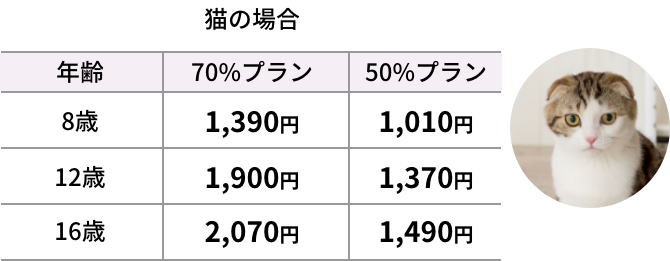 猫の基本保険料は種類・品種による違いはありませんが年齢および支払割合により異なります。2年目以降は、どうぶつの年齢が1歳上がるごとに基本保険料も原則、ご契約継続の時点で毎年上がります。