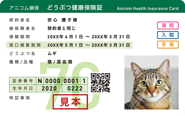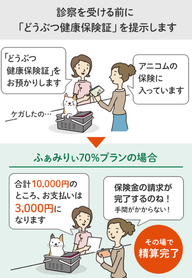 「どうぶつ健康保険証」を「どうぶつ健保」対応病院の窓口に提示するだけで、保険金の請求が完了します。