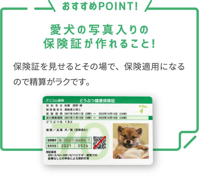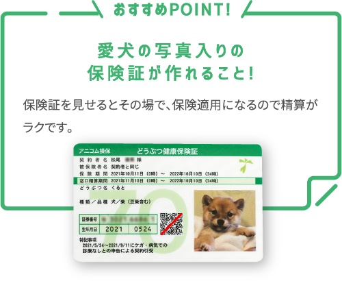 犬を迎えるのが初めてだったので、まず保険には入っておこうと思い一括見積サイトで見積を取って、情報収集しました。資料を見ても各社の違いがあまりわからずどうしようかと迷っていたところ、友人から「ペット保険ならアニコムがいいよ!」「保険証があるから便利だし、ほとんどの病院で使えるよ!」と教えてもらい、加入することに。かかりつけの動物病院でももちろん保険証が使え、窓口精算ができてとても便利です。また、お迎えしたブリーダーさんやネット情報で、犬はパテラ(膝蓋骨脱臼)になりやすいと聞いていたので、もしもパテラになってしまったときにしっかり補償されることもポイントでした。また、保険証が便利なだけではなく、「腸内フローラ測定」が毎年無料で受けられるのもとてもうれしいサービスだなと思っています!