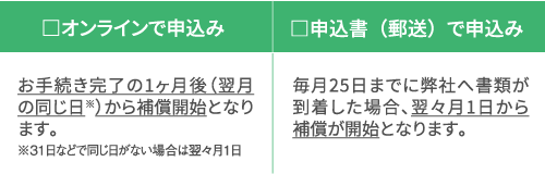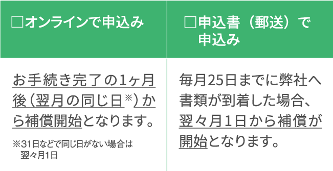 手続き完了から補償開始日までは日数がかかり、申込方法により異なります。