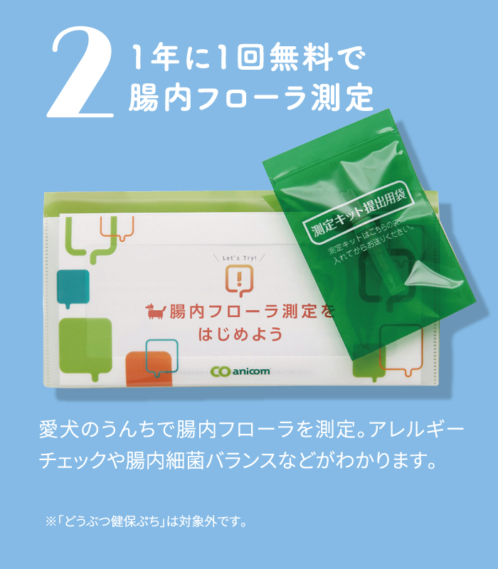 うんちを採って郵送するだけでできる手軽さがいいですね!うちのコは、おなかが弱かったので0歳の間は下痢が多かったのですが「腸内フローラ測定」をやって、その結果からビフィズス菌と肥満菌が少ないことがわかりました。体重が増えないのもそのせいだったのかな、体質だったんだなとわかりました。その結果を参考に、消化器サポートのフードを食べるようになり、1歳を過ぎてからは下痢は少なくなってきました。また来年「腸内フローラ測定」を受けてみて、数値が変わっているのか楽しみです。